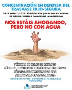 Llegó la hora de la verdad. El próximo 24 de enero a las 10:00 horas llevaremos a cabo la «CONCENTRACIÓN EN DEFENSA DEL TRASVASE TAJO-SEGURA” en la Moncloa (Madrid). Vamos a reivindicar justicia para las miles y miles de familias que viven gracias a la agricultura y al #TrasvaseTajoSegura. NO FALTES. EL FUTURO DEL LEVANTE ESTÁ EN JUEGO ¡TE ESPERAMOS! Infórmate en tu Comunidad de Regantes.